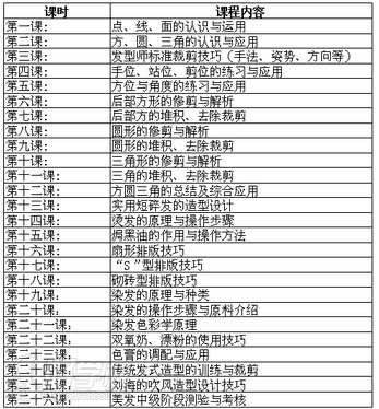 課程主要內容包括:點、線、面的認識與運用、方、圓、三角的認識與應用、發型師標準裁剪技巧(手法、姿勢、方向等)、手位、站位、剪位的練習與應用、方位與角度的練習與應用、后部方形的修剪與解析、后部方的堆積、去除裁剪、圓形的修剪與解析、圓形的堆積、去除裁剪、三角形的修剪與解析、三角的堆積、去除裁剪、方圓三角的總結及綜合應用、實用短碎發的造型設計、燙發的原理與操作步驟、焗黑油的作用與操作方法、扇形排版技巧、“S”型排版技巧、砌磚型排版技巧、染發的原理與種類、染發的操作步驟與原料介紹、染發色彩學原理、雙氧奶、漂粉的使用技巧、色膏的調配與應用、傳統發式造型的訓練與裁剪、劉海的吹風造型設計技巧、美發中級階段測驗與考核、開店就業指導、燙發技巧、畢業考核。
